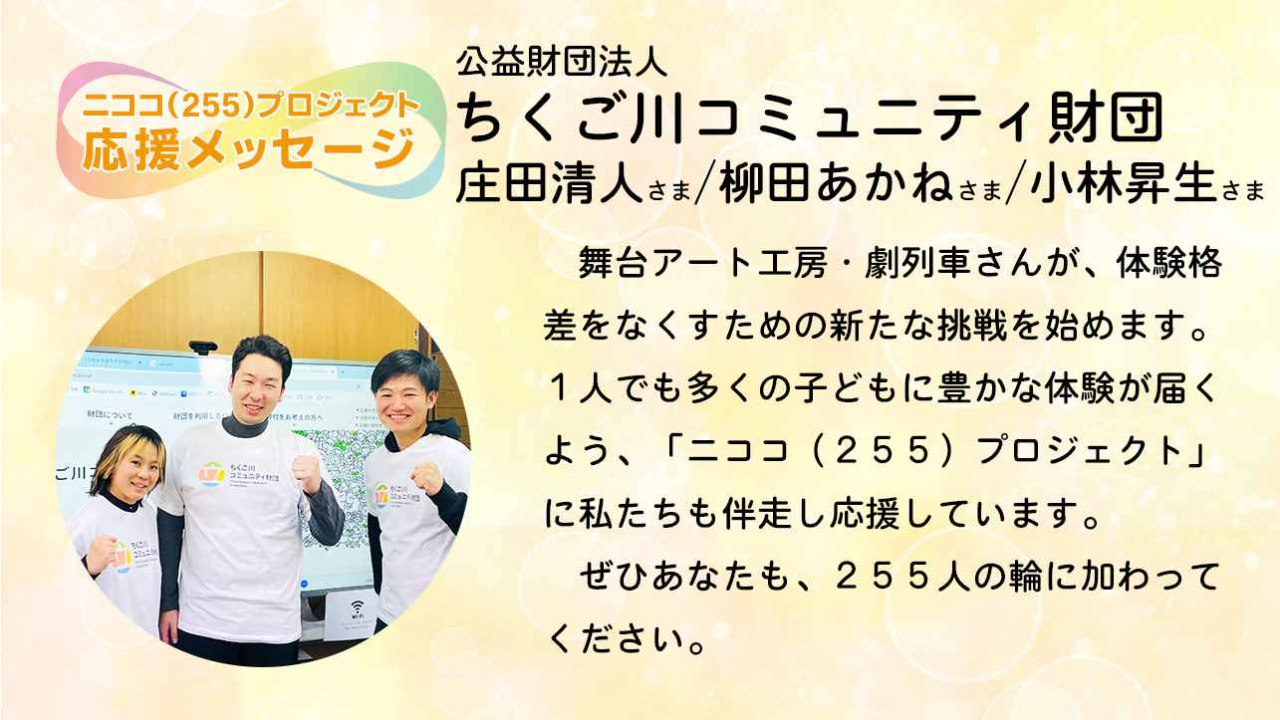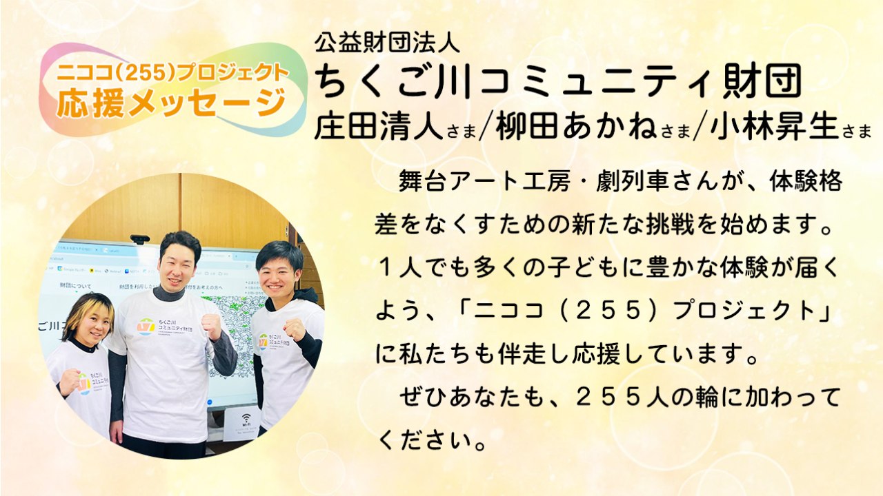 舞台アート工房・劇列車さんが、体験格差をなくすための新たな挑戦を始めます。1人でも多くの子どもに豊かな体験が届くよう、「ニココ(255)プロジェクト」に私たちも伴走し応援しています。ぜひあなたも、255人の輪に加わってください。