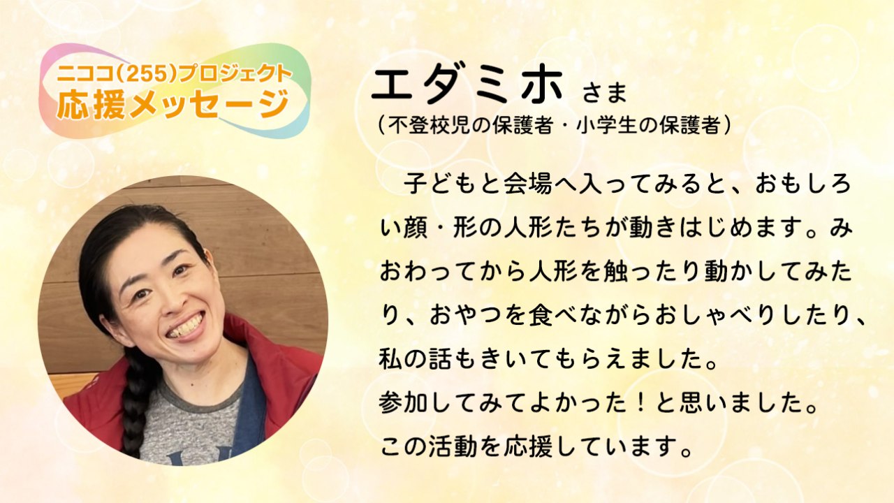 小学生の保護者であるエダミホさまから、ニココプロジェクトへの応援メッセージをいただきました!ありがとうございます!