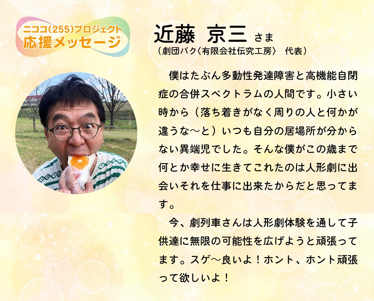 劇団バク〈有限会社伝究工房〉代表の近藤京三さまより応援メッセージをいただきました!