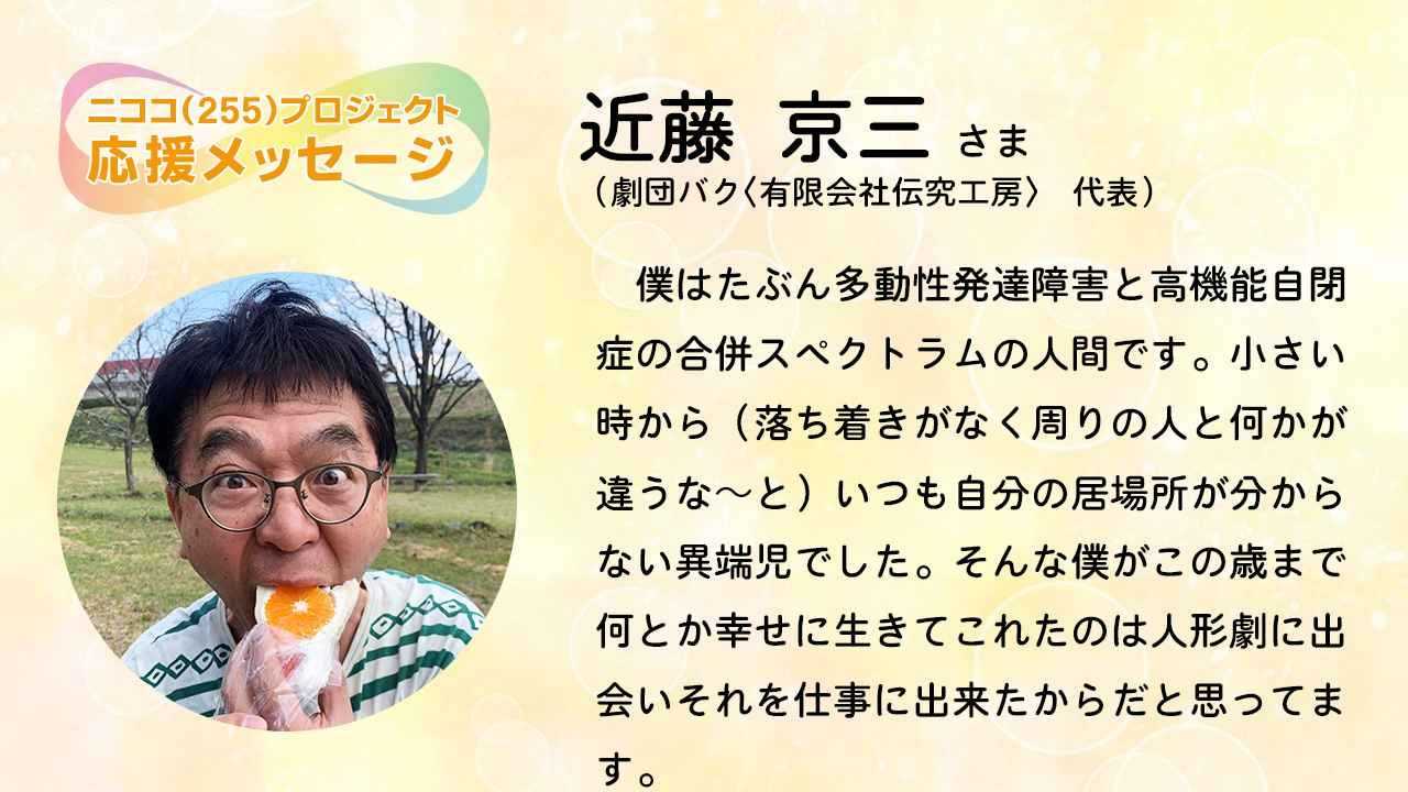 福岡と東京に事務所を構え全国に人形劇を届ける劇団バクの代表・近藤京三さまから、ニココプロジェクトへの応援メッセージをいただきました!ありがとうございます!