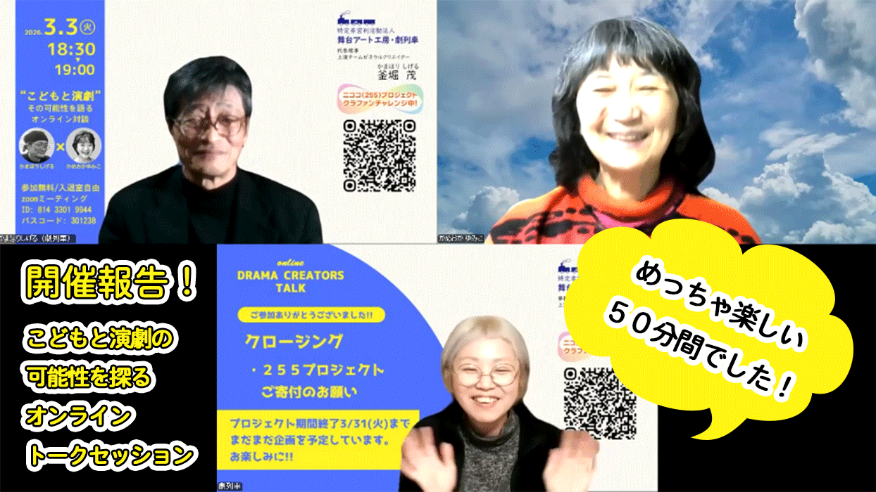 神奈川在住のかめおかゆみこ様をゲストにお迎えし、演劇クリエーターによるトークセッションを昨日3/3に開催いたしました!福岡×神奈川をオンラインでつないで、『“こどもと演劇”の可能性って何だろう?』というトークテーマで実施した対談です。