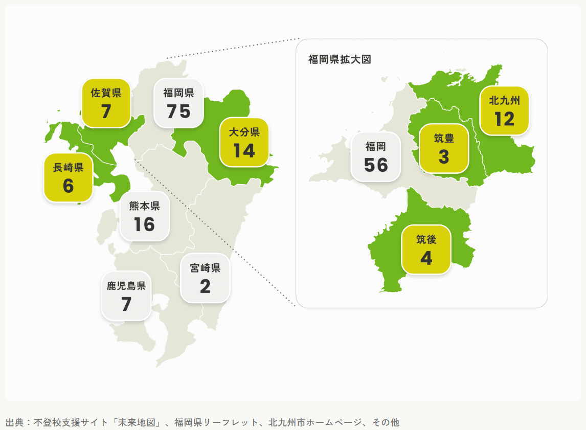 たとえ費用を捻出できたとしても、通える場所が近くにないという問題があります。フリースクール等の数には、深刻な地域格差が存在するのです。福岡県には75箇所のスクールがありますが、佐賀県には7箇所、長崎県には6箇所、大分県には14箇所しかありません。