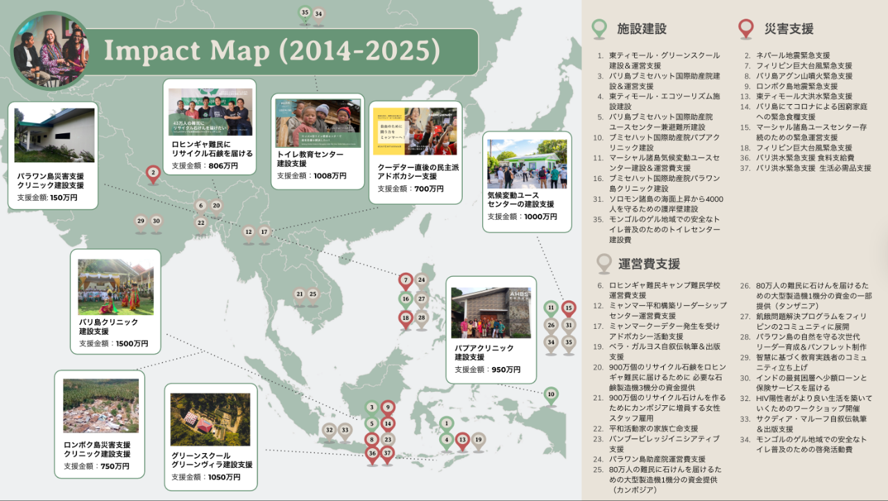 2014年から過去11年間で、1億3000万円を超えるご寄付を承り、IMPACT HERO活動するアジア・太平洋地域11カ国で37のプロジェクトへの支援を通じて、累計614万人へ支援を届けてきました。