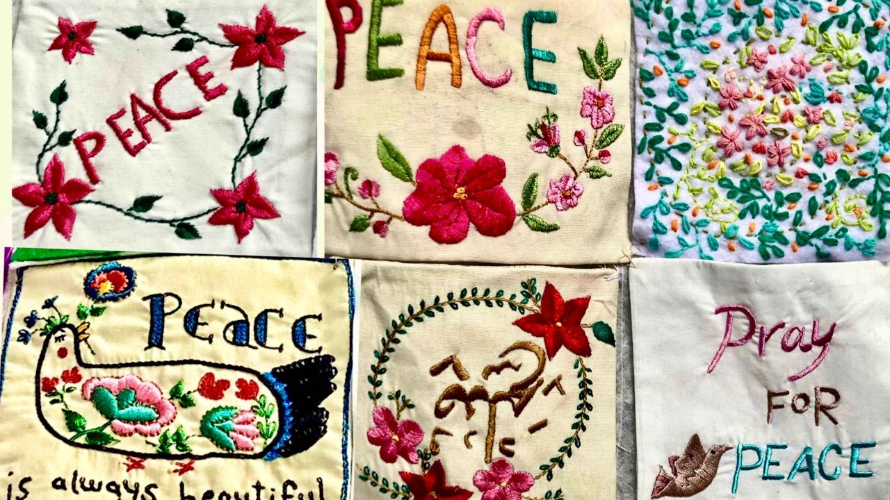 写真はEJAADの女性たちの刺繍です。一針一針、平和への思いをこめて作りました。
