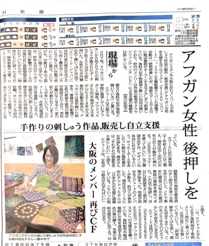 2022-10-22 16:14EJAADの活動がNHKで紹介されました!10月19日のNHK総合「ほっと関西」にてEJAADの特集が放映されました。しばらくの間、NHK WEBにてご覧いただけます。 「アフガニスタン “刺しゅうを希望に”紡がれる支援の輪」 https://www3.nhk.or.jp/kansai-news/20221019/2000067458.html EJAADアフガニスタンのリーダー、ヘナさんも登場して現地の女性の現状を伝えています。ぜひご覧ください!2022-10-22 16:14EJAADの活動がNHKで紹介されました!10月19日のNHK総合「ほっと関西」にてEJAADの特集が放映されました。しばらくの間、NHK WEBにてご覧いただけます。 「アフガニスタン “刺しゅうを希望に”紡がれる支援の輪」 https://www3.nhk.or.jp/kansai-news/20221019/2000067458.html EJAADアフガニスタンのリーダー、ヘナさんも登場して現地の女性の現状を伝えています。ぜひご覧ください!
