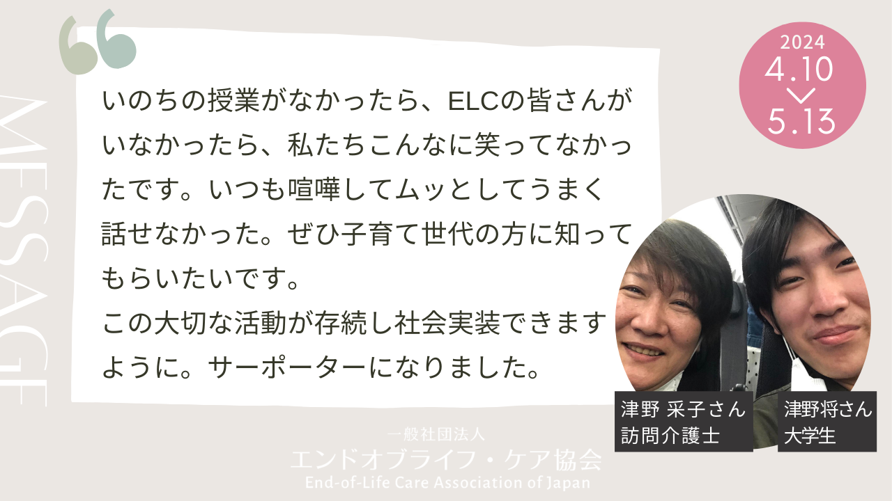 4/13のエンドオブライフ・ケア協会設立9周年シンポジウムにてお話くださった大学2年生の津野将さんと、お母さまの津野 采子さんからのメッセージをご紹介いたします。