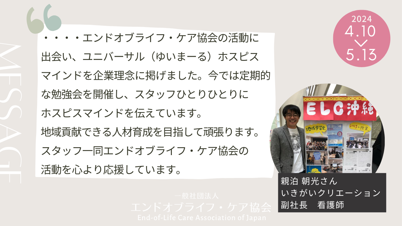 株式会社いきがいクリエーションは、医療、介護、福祉の会社です。人材育成で大切なのは、マインド作りだと思っています。会社はどこへ向かうのか。何を大切にしているのか。共通言語が必要だと感じていました。エンドオブライフ・ケア協会の活動に出会い、ユニバーサル(ゆいまーる)ホスピスマインドを企業理念に掲げました。今では定期的な勉強会を開催し、スタッフひとりひとりにホスピスマインドを伝えています。地域貢献できる人材育成を目指して頑張ります。スタッフ一同エンドオブライフ・ケア協会の活動を心より応援しています
