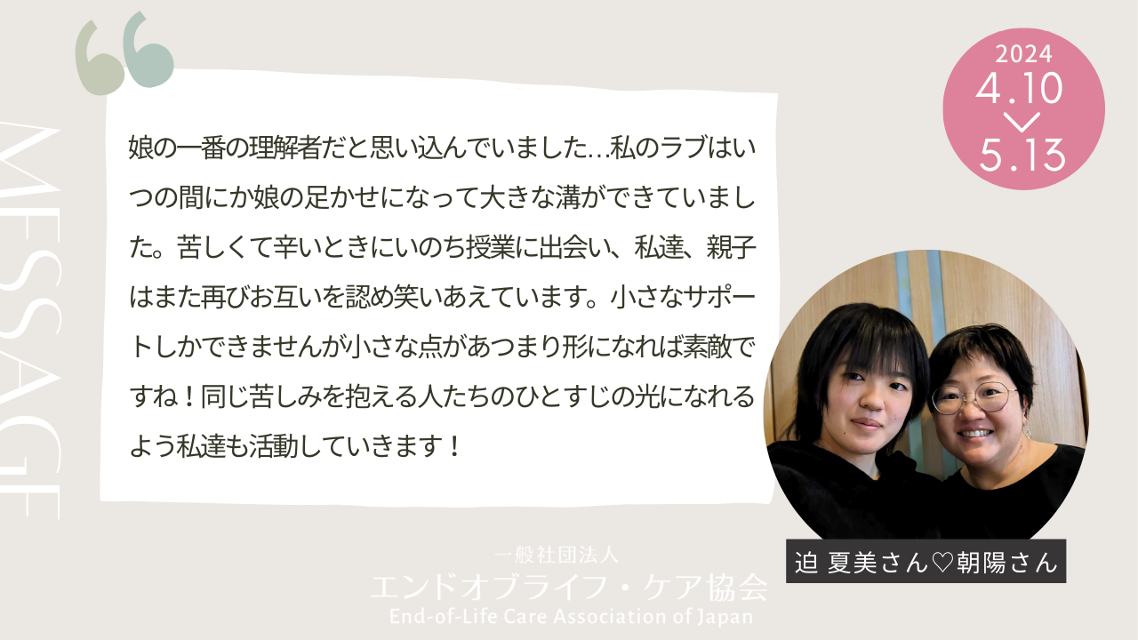 母娘で「折れない心を育てるいのちの授業」認定講師となられた、迫 夏美さんと朝陽さん。高校生の朝陽さんは先日のエンドオブライフ・ケア協会設立9周年シンポジウムで、ご自身が抱えていた生きづらさや、ご自身の変化を語ってくださいました。