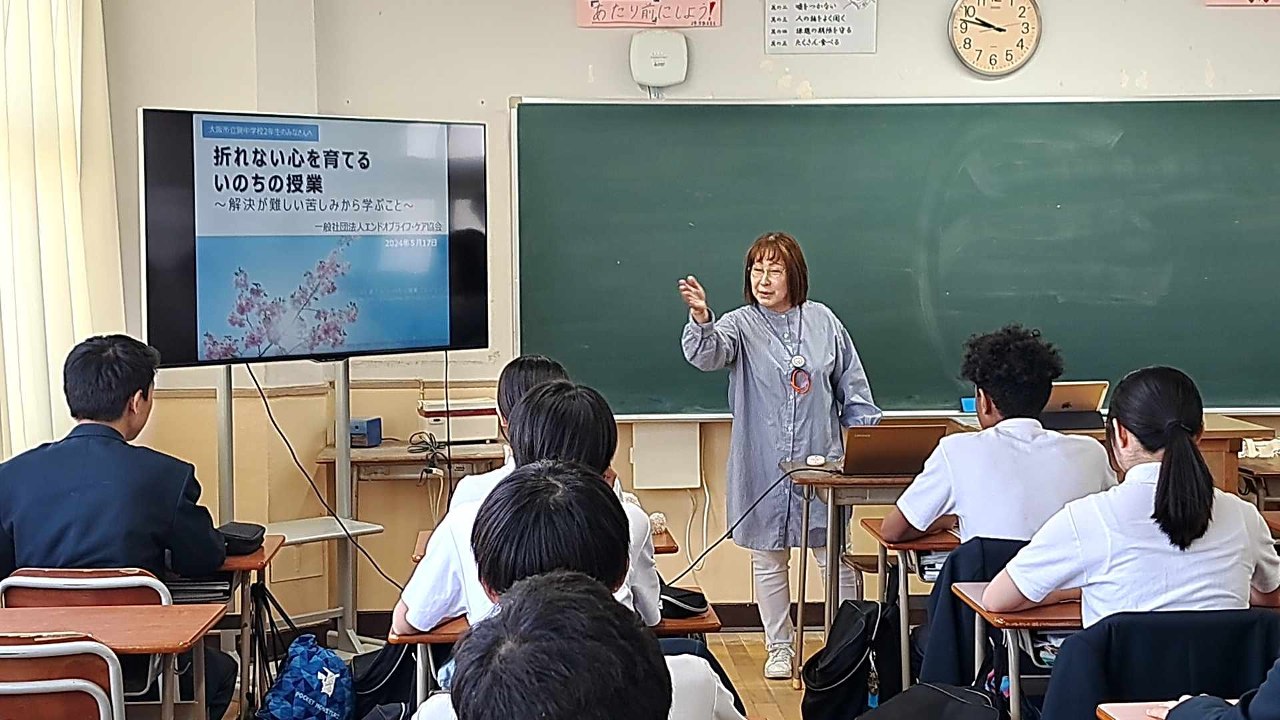 本日5/17、大阪市内の学校への出前授業としては今年度最初の授業として、中学校2年生3クラスに、「折れない心を育てるいのちの授業」を大阪近郊の講師がお届けに伺いました。