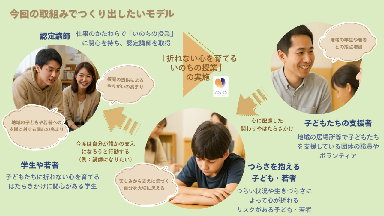 この関わり方は、子ども若者にも伝えられる。そう信じて始めた「折れない心を育てる いのちの授業」プロジェクトは、少しずつ地域の担い手たちに広がり、次の世代へとバトンが渡り始めています。