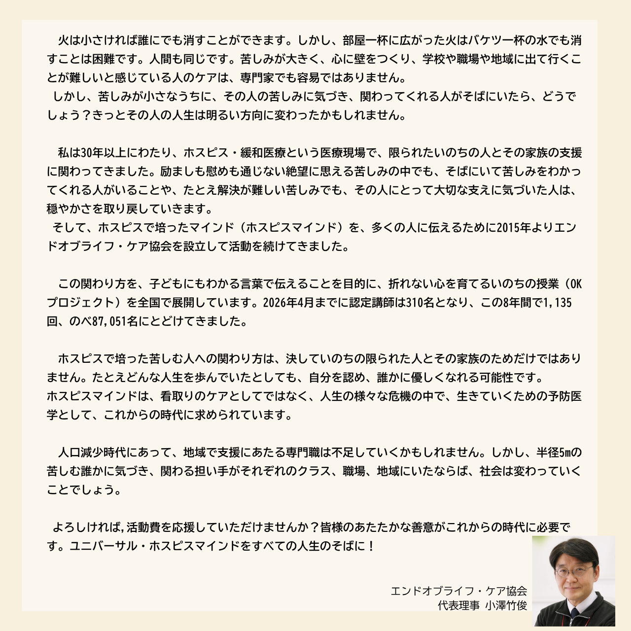 現在、弊協会の講座を受講し、認定を受けたファシリテーターや「折れない心を育てるいのちの授業」認定講師が、地域コミュニティにユニバーサル・ホスピスマインドをお届けし、実践できるような活動の多くはボランティアで行っています。これからも安定的に活動を継続していくために、経済的な負担も少なくしていきたいと思います。