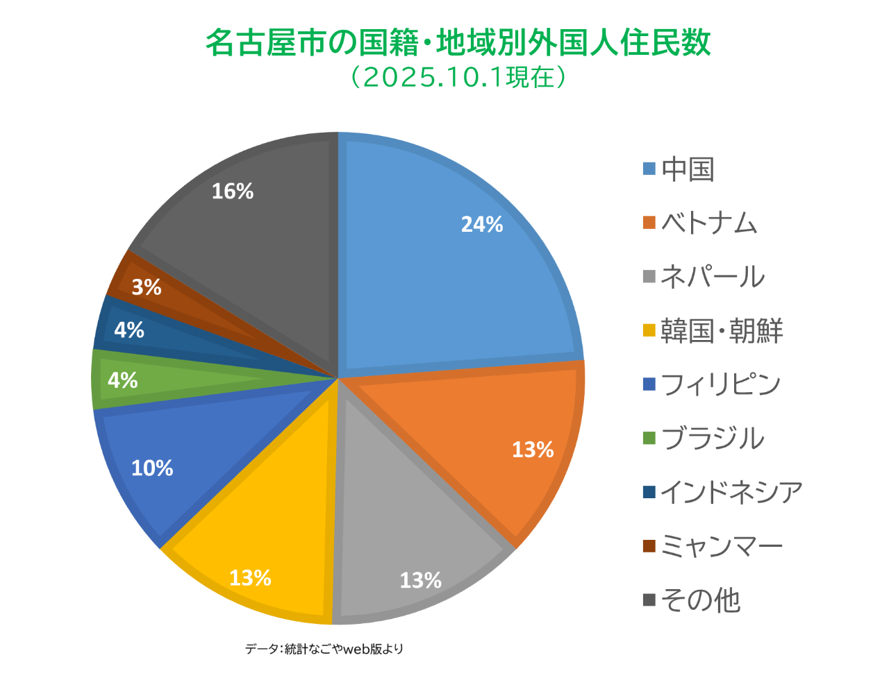 2025年10月時点の名古屋市の外国人住民総数は10万人を超え、150を超える国や地域の人々が暮らしています。国籍別では中国、ベトナム、ネパール、韓国・朝鮮、フィリピンなどの出身者が多く生活しています。年齢別でみると、20代が43,536人(約31.8%)、30代が22,665人(約20.8%)と若年層が多くを占め、義務教育年齢にあたる子どもたちは6,544人います。