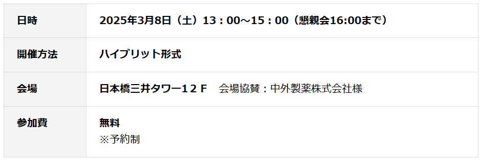 ※会場参加は、患者・ご家族・ご友人枠15名、その他支援者・企業関係者枠15名の限定となります。会場参加をご希望の方は、お早めにお申し込みください。