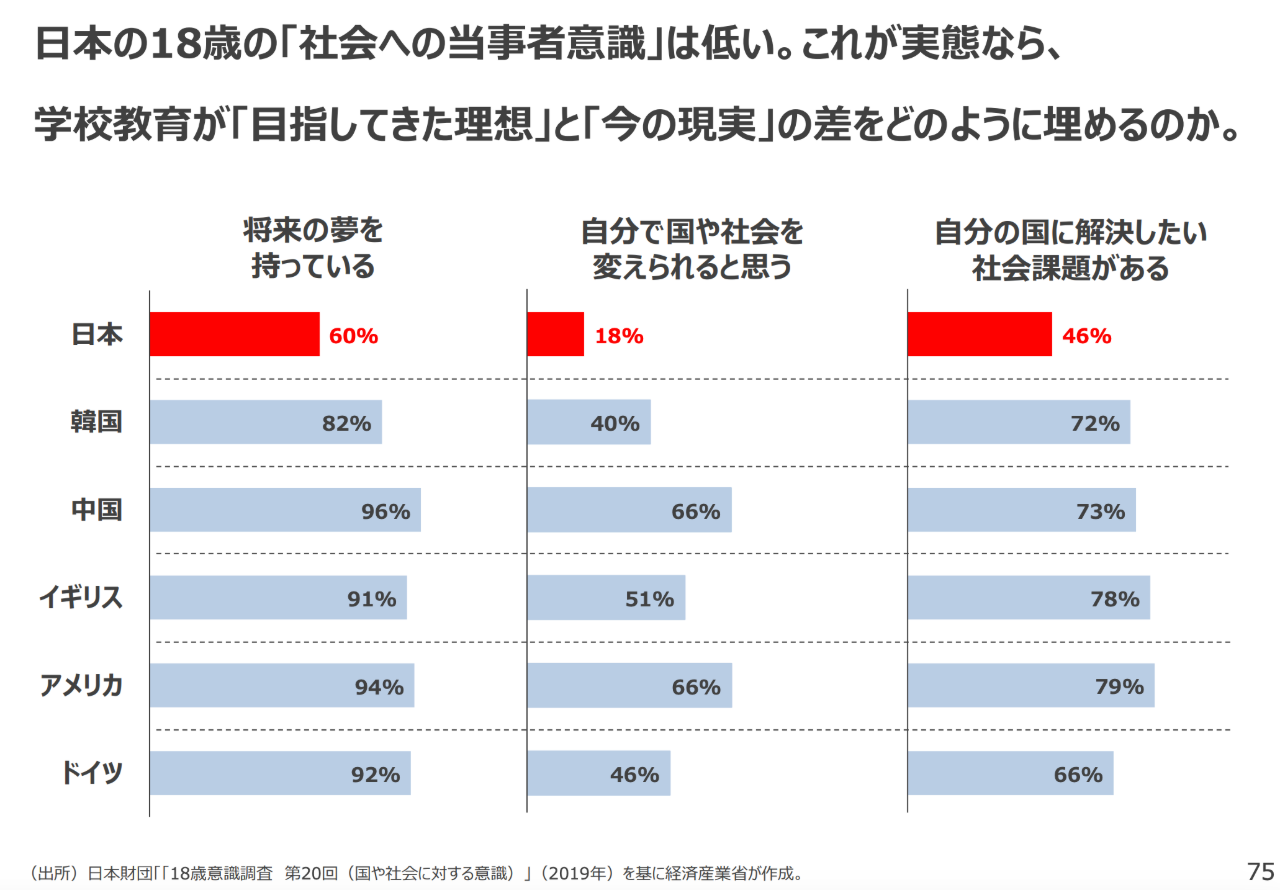 下記データが示すのは、日本の18歳が夢・自己肯定感・社会への当事者意識すべてにおいて、世界で最も低いレベルにあるという現実です。安心して、考え、学び、発言し、反応し合う場所はこれらの課題において非常に有効であると過去の活動を振り返って実感しています。