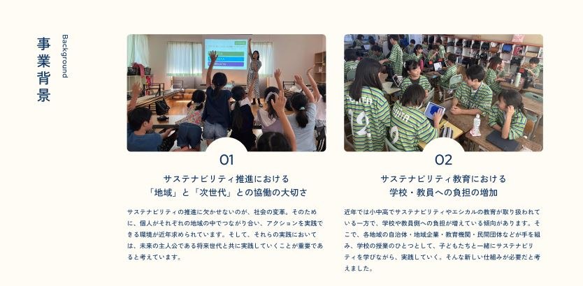 近年、教育現場で重要視されているSDGsやESD。ESDとは、「持続可能な開発のための教育」つまり「次世代のサステナビリティ人財を育む教育」のこと。 私たちは、サステナビリティの専門家であり、子どもたちの学びに伴走する「エシカル・リーダー」を軸とした、サステナビリティの実践型教育プログラムを開発し、地域の教育現場へ提供しています。