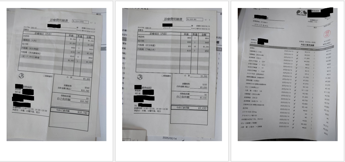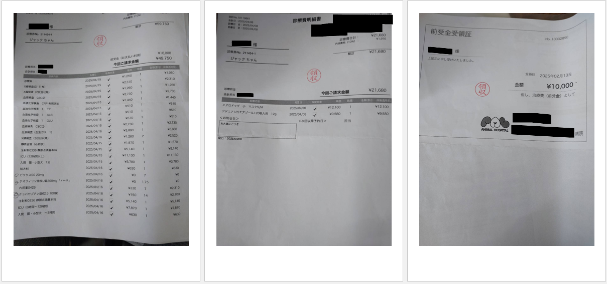 肺炎で入退院を繰り返したジャック。診療費明細書は計16枚(一部掲載)、27万円程の支払いとなりました。現在は病状も落ち着き、預かりボランティアのお宅で仲間の保護犬たちと賑やかに過ごしています。素敵なご縁が訪れますように。