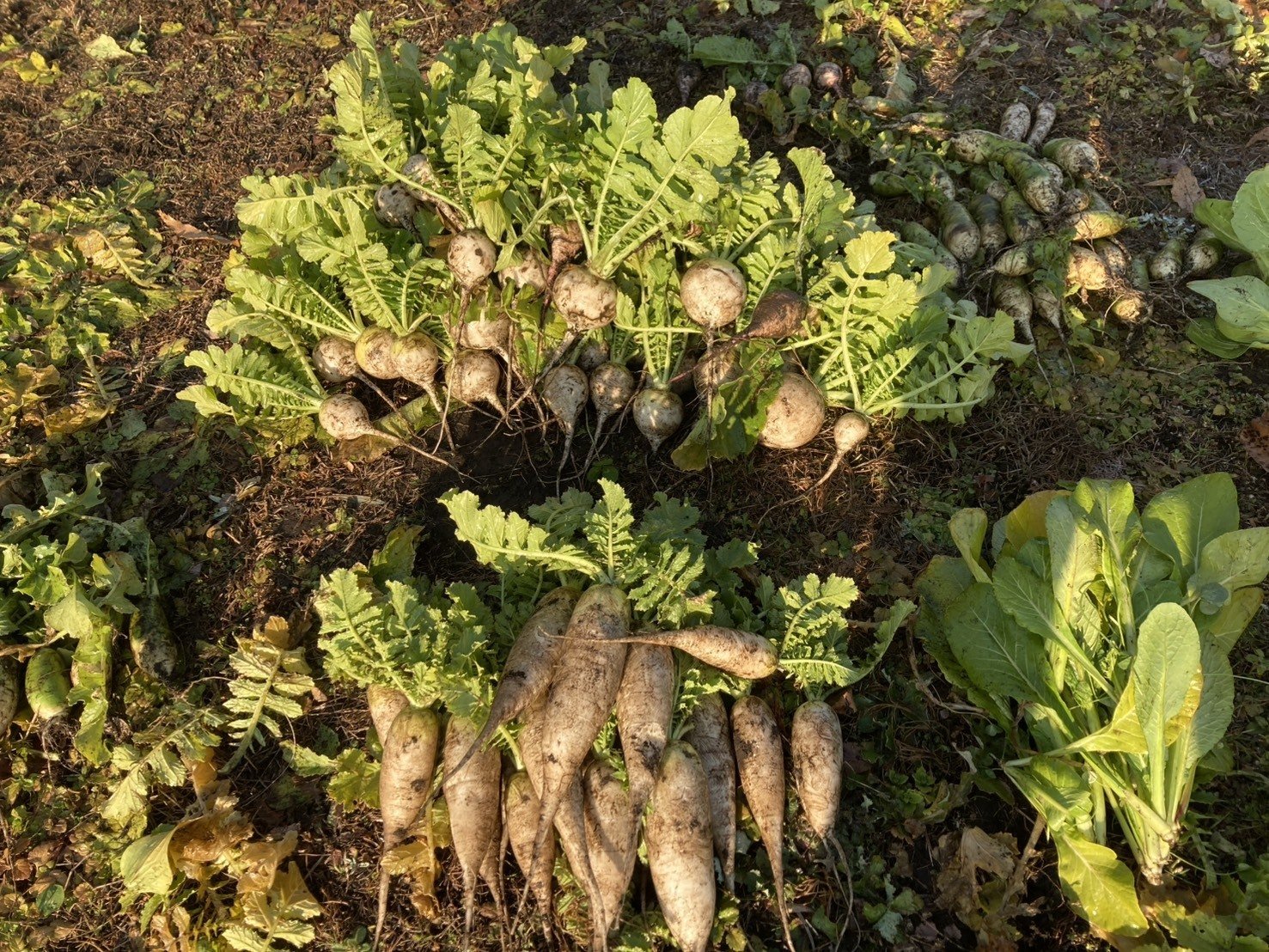 山林では、イノシシなどの獣害対策として電気柵を設置する準備を進めました。また、耕作放棄地でメンバーが耕うん機を使って畑を耕し、畝をつくりました。畝が完成した後はブロッコリーとキャベツと白菜と大根と人参を植えました。その後、チンゲン菜、大根、ビタミン大根、聖護院大根、野沢菜、雪菜など根菜から葉物野菜まで多種多様な野菜を植え、収穫に至っています。