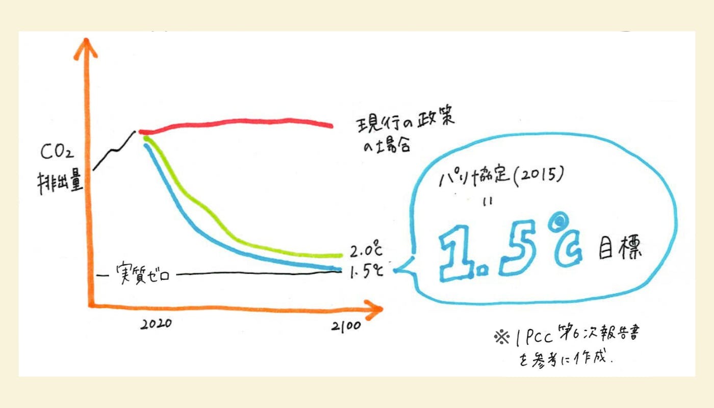(地球温暖化による気候変動の影響を抑えるためには、産業革命前からの温度上昇を1.5℃以内に留めることが重要だとされています(「1.5℃目標」)。「1.5℃目標」達成のためには、2030年までに二酸化炭素排出を世界で50%以上削減し、2050年までには実質排出ゼロにしなければならないとされています。しかし、世界の二酸化炭素排出は今でも増え続けています。参考:「IPCC第6次評価報告書」 )