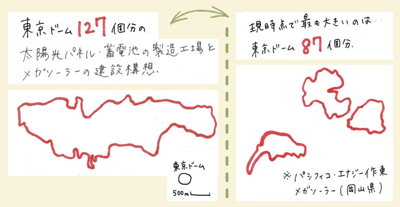 約600ヘクタール(=東京ドーム127個分)の山林に、太陽光パネルと蓄電池の製造工場と、メガソーラーを整備する構想です(※)。作られてしまうと、国内最大級の生産規模になると発表されています。なお、この構想は町内会などから抗議活動を受け、今のところ進捗はありません。