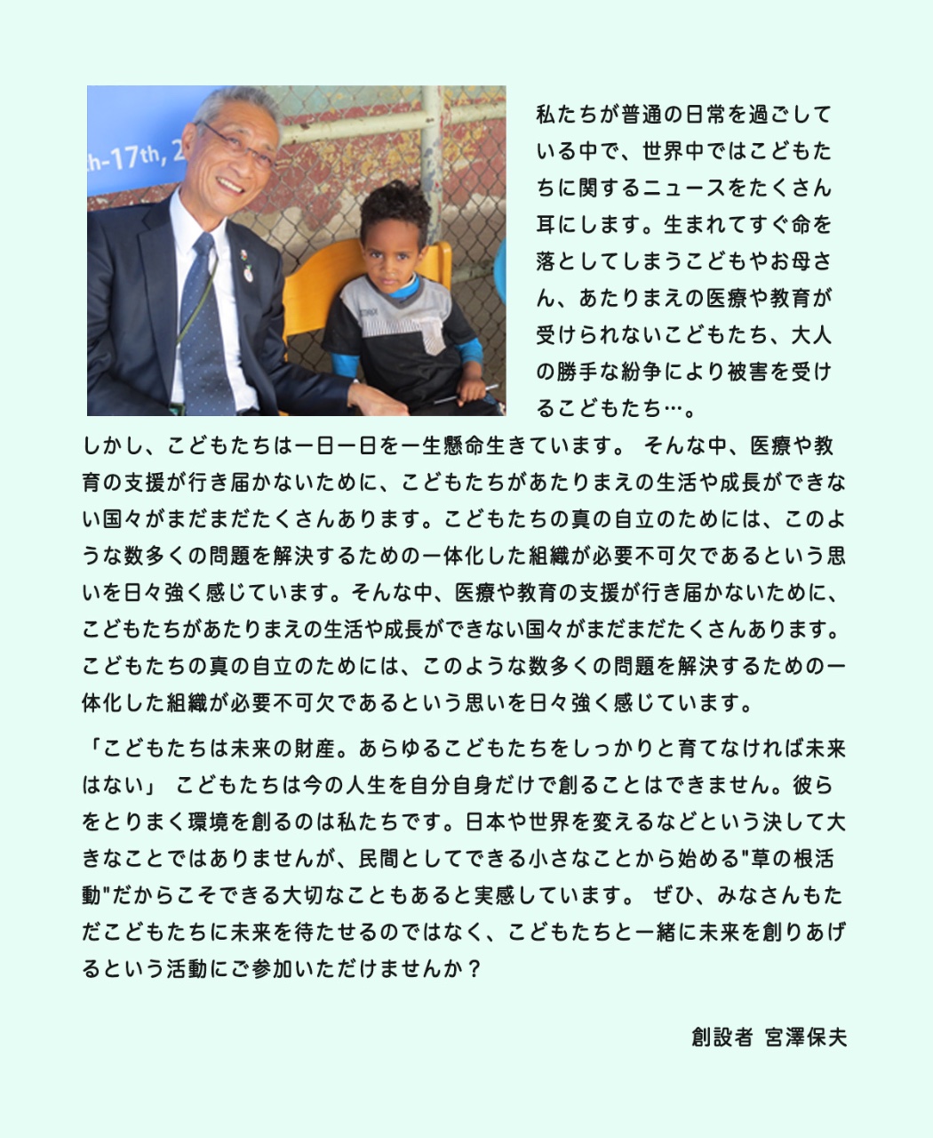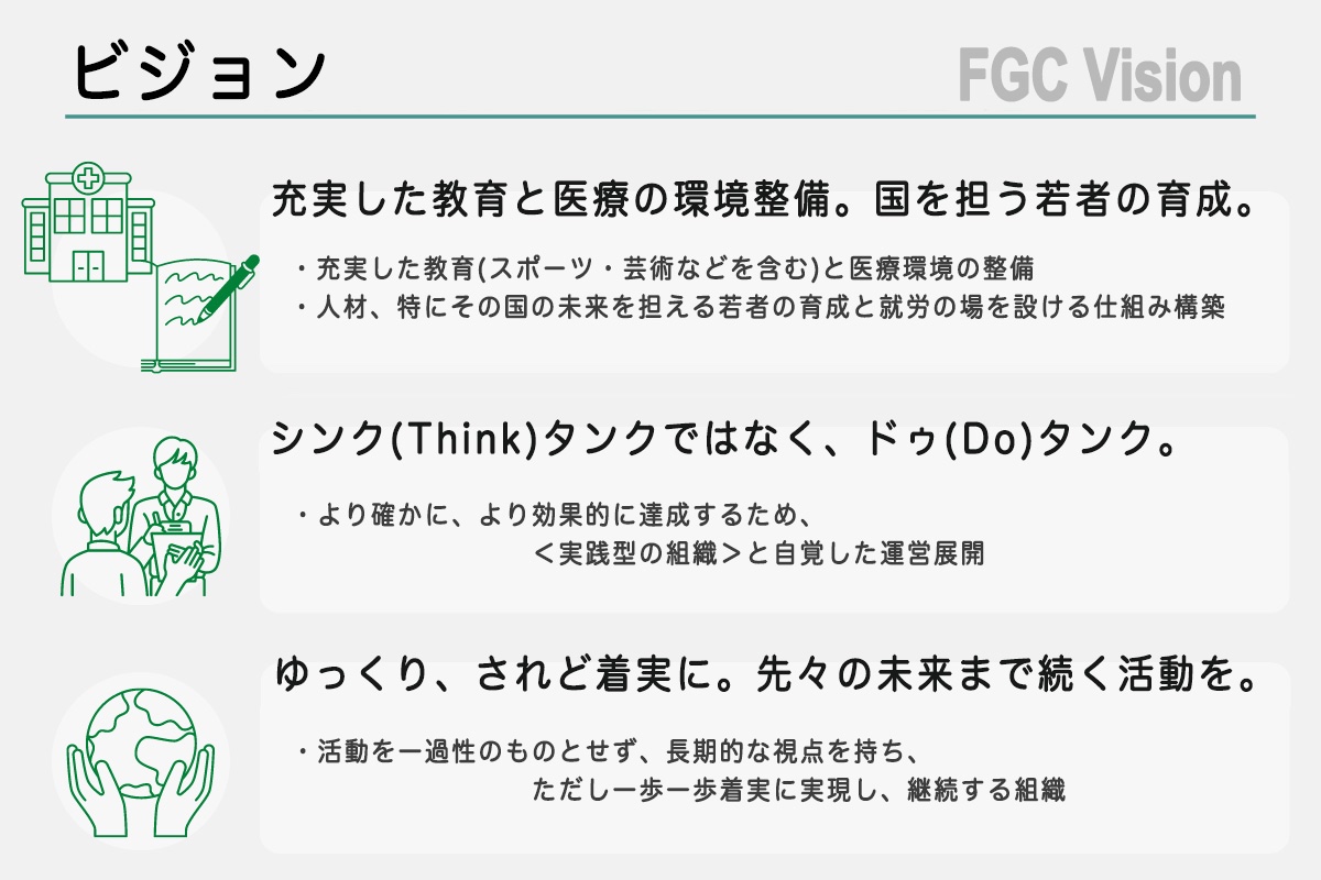 ゆっくり、されど着実に。教育と医療で、こどもたちの明日をつなげる 『こどもたちは未来の財産。あらゆるこどもたちをしっかりと育てなければ未来はない。』 私たちは一過性の支援ではなく、持続的に未来へつながる活動を続け、社会に必要な環境と仕組みを作り上げていきます。