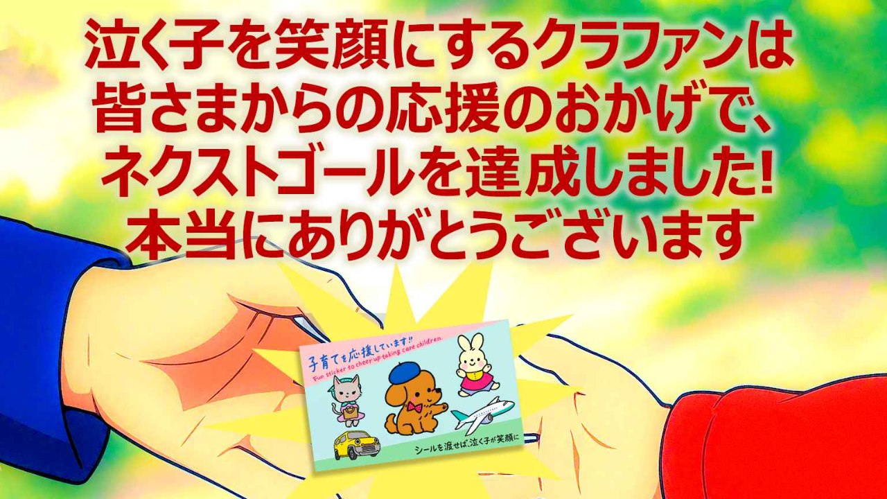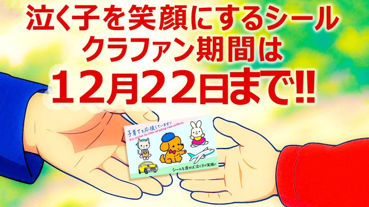 2025-12-11 10:55残り約10日になりました!泣く子を笑顔にするシールのクラファン、もう残り10日となりました! 多くの方に応援頂いたおかげで、あと20万円で最後のゴール達成です!2025-12-11 10:55残り約10日になりました!泣く子を笑顔にするシールのクラファン、もう残り10日となりました! 多くの方に応援頂いたおかげで、あと20万円で最後のゴール達成です!