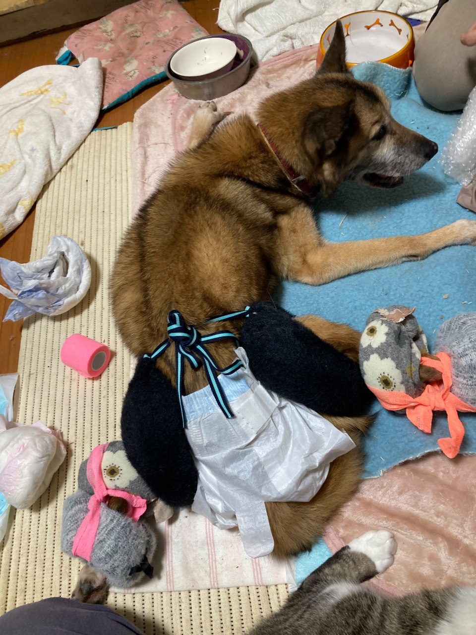 ワンコにゃんこハウス(当団体の保護施設)で暮らす犬のみなみちゃんは、去年の10月頃からあまり歩けなくなってしまいました。お散歩は介助付き。ハウスの中では滑ったり褥瘡ができないように床一面に布を敷き、夜間はオムツをしたりして生活しています。