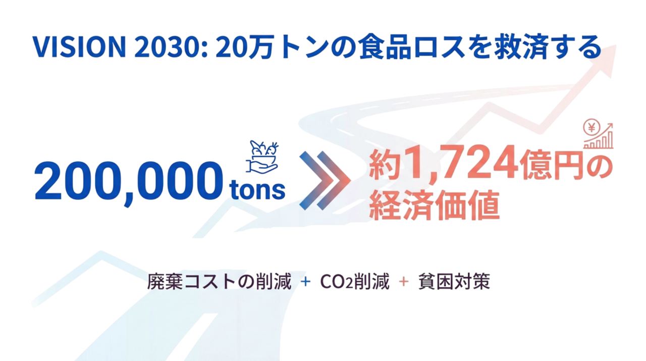 私たちのゴールは、単に一時的な食料を届けることではありません。一度仕組みが整えば、毎年1,700億円分の価値を生み出し続け、誰もが食に困ることのない持続可能な社会インフラを日本中に定着させることです。