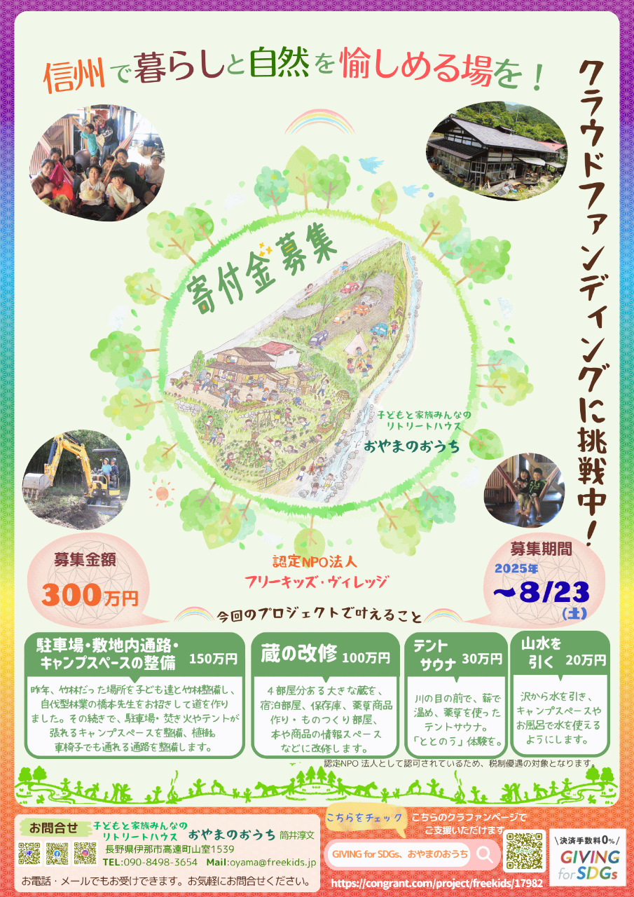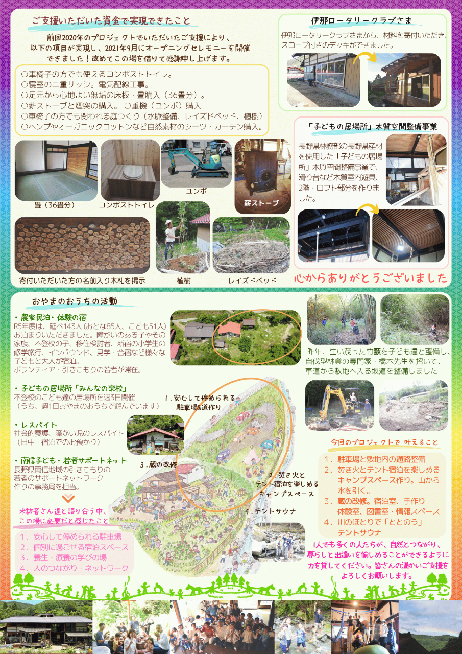 信州高遠の山の中。築150年の古民家を改修し「おやまのおうち」をオープンして3年。訪れてくれた多くの方々が、晴れやかな自然の暮らしを体感し「生きる力」を取り戻していく姿をよろこばしく目にすることができました。