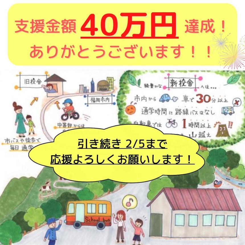 2023-02-06 10:54応援ありがとうございました!昨年12/24よりスタートした「子どもたちへのスクールバスプレゼントプロジェクト」のクラウドファンディング、昨日を持って終了となりました。2023-02-06 10:54応援ありがとうございました!昨年12/24よりスタートした「子どもたちへのスクールバスプレゼントプロジェクト」のクラウドファンディング、昨日を持って終了となりました。