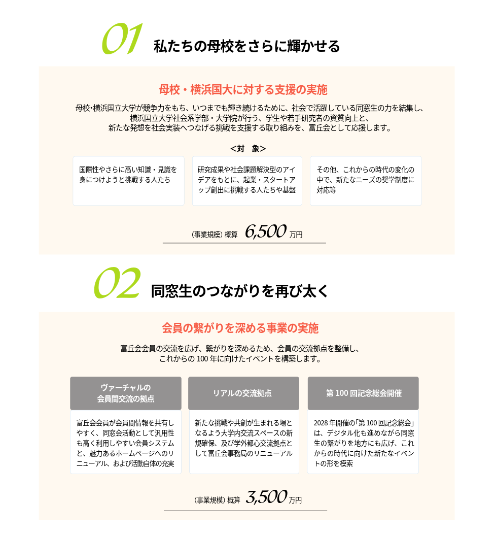 そこで私たちは、この100周年の節目に、「私たちの母校をさらに輝かせる」「同窓生のつながりを再び太く」の2つを柱として記念事業を実施し、これらを強力に推進すべく、このたび募金をお願いすることとなりました。