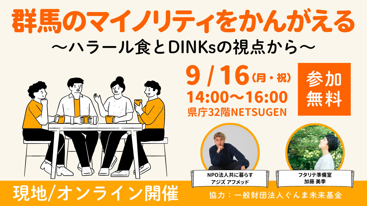 2024-09-09 17:43【お知らせ】群馬のマイノリティをかんがえる〜ハラール食とDINKsの視点から〜一般財団法人ぐんま未来基金の助成プログラムに採択された2団体が、合同で事業説明会をおこないます。 団体の取り組みをご紹介するとともに、みなさまとのWSを交えながら群馬のマイノリティについて理解を深めていただきます。2024-09-09 17:43【お知らせ】群馬のマイノリティをかんがえる〜ハラール食とDINKsの視点から〜一般財団法人ぐんま未来基金の助成プログラムに採択された2団体が、合同で事業説明会をおこないます。 団体の取り組みをご紹介するとともに、みなさまとのWSを交えながら群馬のマイノリティについて理解を深めていただきます。
