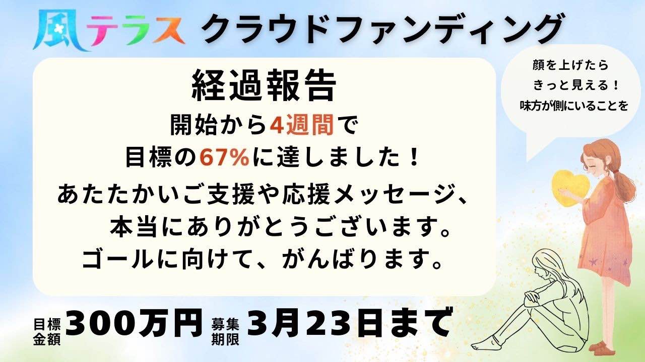 2月7日にスタートしたクラウドファンディング 「風俗だから助けを求めにくい―現状を変えたい」 は、4週間が経過いたしました。 これまでに148人の方からご寄付をいただき、2,017,000円が集まっています。 応援コメントもとてもうれしいです。 目標達成まで、まだ道のりは続きますが、最後まで走り抜けたいと思います。 ご支援くださった皆さまからの再度のご支援や情報発信もとても励みになります。 応援をどうぞよろしくお願いいたします!