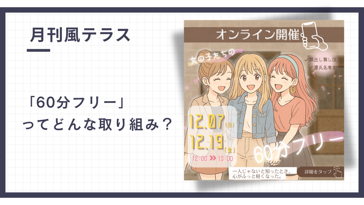 2025-03-15 12:00【活動報告】自助グループ「女の子たちの60分フリー」 対面開催しました!2022年7月より、風テラスは、風俗で働く女の子たちのサポートグループ『女の子たちの60分フリー』の活動をオンラインで行ってきました。 「女の子たちの60分フリー」は、性風俗で働く、または働いていた女性たちが悩みや気持ちをオンライン上で共有する自助グループの一つです。風テラスのスタッフメンバーも参加して話の流れなどをサポートするため、サポートグループとも表現しています。 そして、今年の1月、通算22回目で、初の対面開催をで実施しました! 続けて2月にも対面開催を行いました。参加したメンバーから嬉しい報告が届きましたので、以下にお伝えしたいと思います!2025-03-15 12:00【活動報告】自助グループ「女の子たちの60分フリー」 対面開催しました!2022年7月より、風テラスは、風俗で働く女の子たちのサポートグループ『女の子たちの60分フリー』の活動をオンラインで行ってきました。 「女の子たちの60分フリー」は、性風俗で働く、または働いていた女性たちが悩みや気持ちをオンライン上で共有する自助グループの一つです。風テラスのスタッフメンバーも参加して話の流れなどをサポートするため、サポートグループとも表現しています。 そして、今年の1月、通算22回目で、初の対面開催をで実施しました! 続けて2月にも対面開催を行いました。参加したメンバーから嬉しい報告が届きましたので、以下にお伝えしたいと思います!