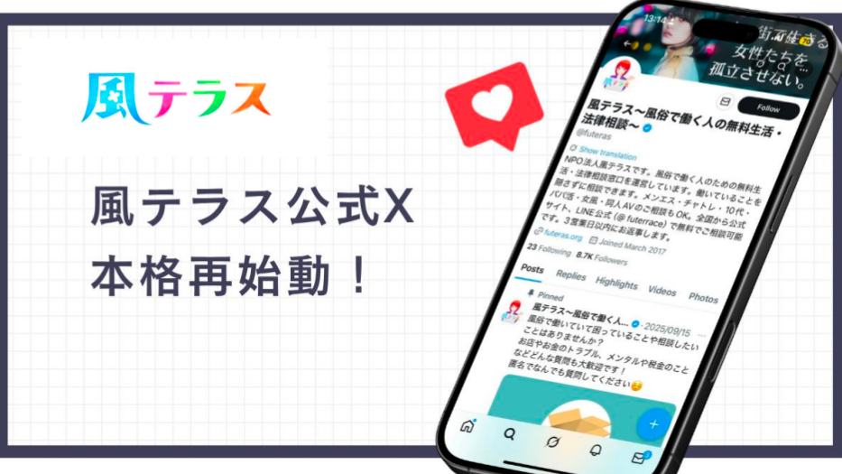2025-09-24 18:00風テラスの活動報告会、10月14日(火)に開催します!10月14日(火)20時~21時に、オンラインによる活動報告会を開催いたします! 風テラスの活動、そして夜の世界の課題解決にご関心のある方に、ぜひご参加頂きたいイベントです。 報告会では、風テラスが日々行っている活動と相談現場の最前線から届いた情報について、お伝えします!2025-09-24 18:00風テラスの活動報告会、10月14日(火)に開催します!10月14日(火)20時~21時に、オンラインによる活動報告会を開催いたします! 風テラスの活動、そして夜の世界の課題解決にご関心のある方に、ぜひご参加頂きたいイベントです。 報告会では、風テラスが日々行っている活動と相談現場の最前線から届いた情報について、お伝えします!