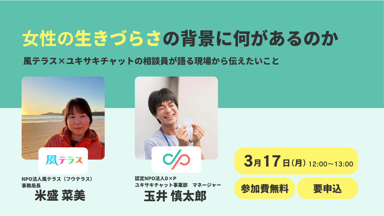 2025-03-12 09:15【3/17(月)参加無料/zoom】D×Pのコラボイベント・女性の生きづらさの背景に何があるのか若年層の貧困をサポートするオンライン相談「ユキサキチャット」を運営している認定NPO法人D×P(ディーピー)とのコラボイベントが開催されます!ユキサキチャットと風テラスの相談員が、社会的孤立や孤独に直面する人々について語ります。2025-03-12 09:15【3/17(月)参加無料/zoom】D×Pのコラボイベント・女性の生きづらさの背景に何があるのか若年層の貧困をサポートするオンライン相談「ユキサキチャット」を運営している認定NPO法人D×P(ディーピー)とのコラボイベントが開催されます!ユキサキチャットと風テラスの相談員が、社会的孤立や孤独に直面する人々について語ります。