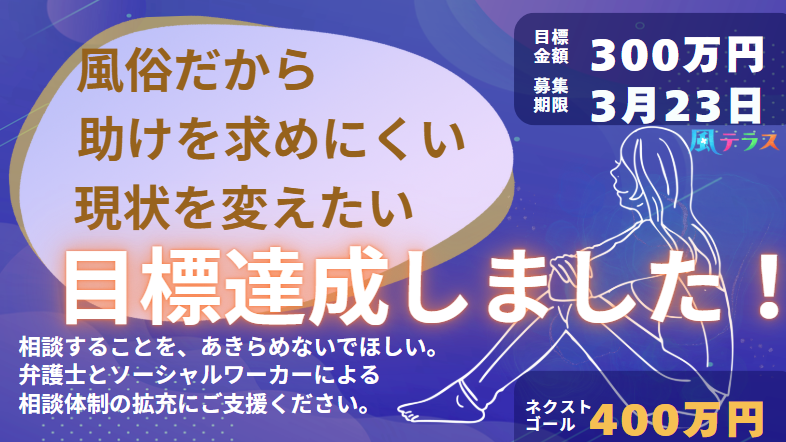 2025-03-20 15:00【速報】クラファン目標金額に達しました!2月7日より開始した相談事業の維持拡充を目指したクラウドファンディングが、 昨夜19日、目標の300万円に達しました!!! これまで総勢230人以上の方からご支援をしていただき、 第一ゴールの300万円に達することができました! 引き続き、23日までよろしくお願いいたします!2025-03-20 15:00【速報】クラファン目標金額に達しました!2月7日より開始した相談事業の維持拡充を目指したクラウドファンディングが、 昨夜19日、目標の300万円に達しました!!! これまで総勢230人以上の方からご支援をしていただき、 第一ゴールの300万円に達することができました! 引き続き、23日までよろしくお願いいたします!