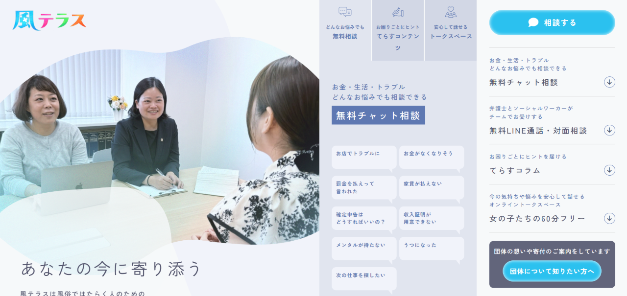 性風俗で働く、または働いていた女性たちが悩みや気持ちをオンライン上で共有する自助グループの一つです。風テラスのスタッフメンバーも参加して話の流れなどをサポートするため、サポートグループとも表現しています。
