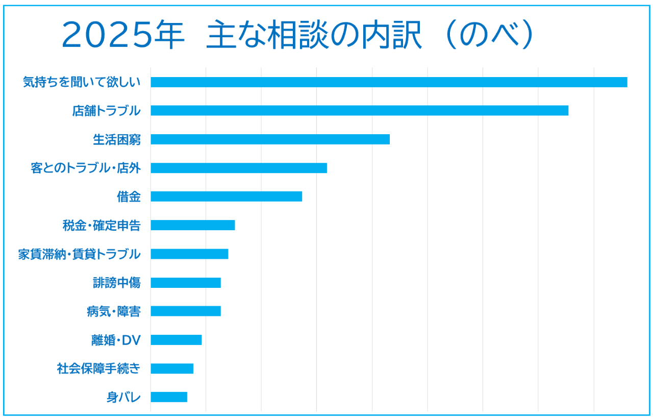 2025年は困難な状況にある夜職女性の方々からの相談が、4,209件と、一昨年に引き続き4,000件を超えました。