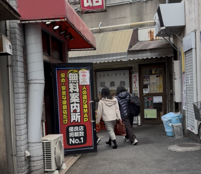 風俗店の紹介をする「無料案内所」や趣ある居酒屋、ラブホテルが立ち並ぶ道を進んで行きます。