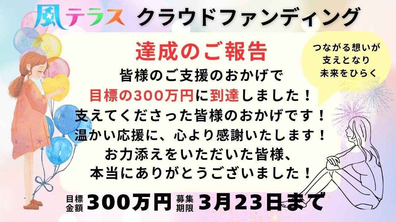 2025-03-26 18:09【クラファン終了御礼】目標額を超えるご支援に感謝!!風テラスのクラウドファンディング、目標達成し、終了いたしました! 目標の300万円を大きく超えた3,428,000円のご寄付が集まりました。2025-03-26 18:09【クラファン終了御礼】目標額を超えるご支援に感謝!!風テラスのクラウドファンディング、目標達成し、終了いたしました! 目標の300万円を大きく超えた3,428,000円のご寄付が集まりました。