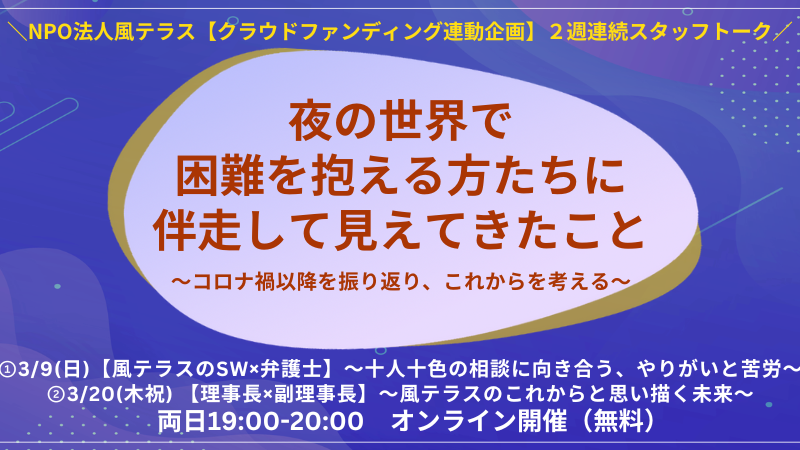 2025-03-05 18:00クラファン連動企画!2週連続スタッフトーク企画開催します!【3月9日(日)、20日(木・祝)】風テラスは、スタッフによる2週連続のオンライン・トークイベントを開催します! 団体のこと、相談事業のことをスタッフによるクロストークでお話していきたいと思います。これまでの活動を振り返るとともに、活動に携わるなかで得たこと、今後力を入れていきたいことなど、メンバーそれぞれの思いを語ります。風テラスのことを身近に感じていただける時間になりましたら幸いです。 【イベント概要】 ■開催日時・内容: ①2025年3月9日(日) 19:00~20:00 【風テラスのSW×弁護士 クロストーク】〜十人十色の相談に向き合う、やりがいと苦労〜 ②2025年3月20日(木祝) 19:00~20:00 【理事長×副理事長 トーク】~風テラスのこれからと思い描く未来~ ■開催方式:ZOOM(オンライン開催) ■参加費:無料 ■主催:NPO法人風テラス2025-03-05 18:00クラファン連動企画!2週連続スタッフトーク企画開催します!【3月9日(日)、20日(木・祝)】風テラスは、スタッフによる2週連続のオンライン・トークイベントを開催します! 団体のこと、相談事業のことをスタッフによるクロストークでお話していきたいと思います。これまでの活動を振り返るとともに、活動に携わるなかで得たこと、今後力を入れていきたいことなど、メンバーそれぞれの思いを語ります。風テラスのことを身近に感じていただける時間になりましたら幸いです。 【イベント概要】 ■開催日時・内容: ①2025年3月9日(日) 19:00~20:00 【風テラスのSW×弁護士 クロストーク】〜十人十色の相談に向き合う、やりがいと苦労〜 ②2025年3月20日(木祝) 19:00~20:00 【理事長×副理事長 トーク】~風テラスのこれからと思い描く未来~ ■開催方式:ZOOM(オンライン開催) ■参加費:無料 ■主催:NPO法人風テラス