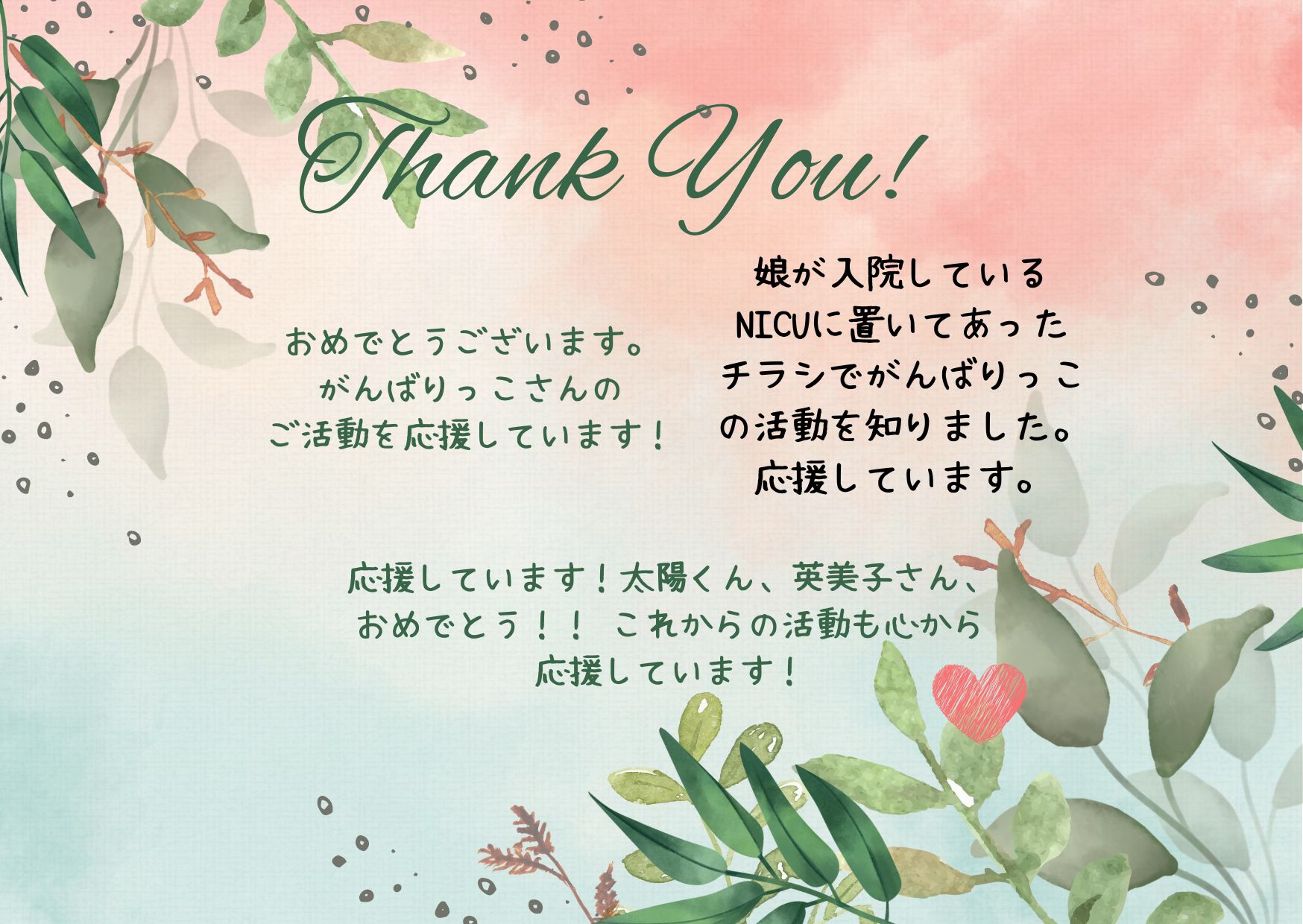 7月21日、代表林英美子の長男太陽氏が22週542gの超未熟児で生まれてきたところから、がんばりっこの活動は始まりました。18年の活動を経て、今年一般社団法人となり、つながりづくりや情報交換のためのがんばりっこの集い47都道府県開催をめざしています。今年度は大阪(8/6中止)・熊本(8/7)・東京・神奈川のみなさんと集いを開催したいと考えています。また各地にいらっしゃるがんばりっこ応援団の先生方に、がんばりっこリーフレットを送付し、NICU入院中・退院後の方にひとりでも多く知っていただきたいと願っています。みなさまからの「おめでとう!」を、これからもうまれてくる小さながんばりっことその家族のために活用してまいります。