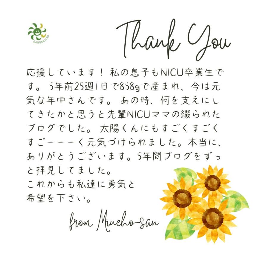応援しています! 私の息子もNICU卒業生です。 5年前25週1日で858gで産まれ、今は元気な年中さんです。 あの時、何を支えにしてきたかと思うと先輩NICUママの綴られたブログでした。 太陽くんにもすごくすごくすごーーーく元気づけられました。本当に、ありがとうございます。5年間ブログをずっと拝見してました。 これからも私達に勇気と希望を下さい。
