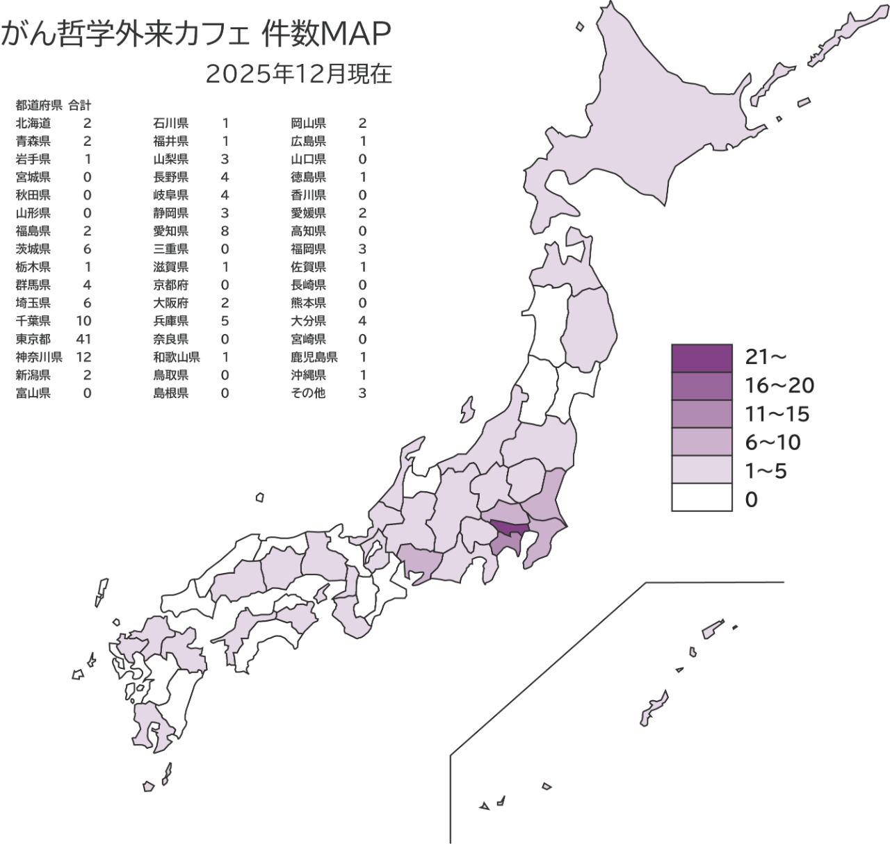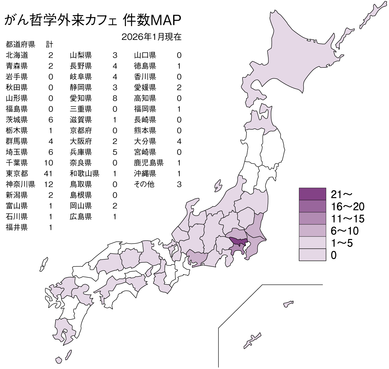 2018年以降、活動を開始し地道にがん哲学を学ぶ仲間でカフェづくりに励んできました。現在のがん哲学カフェ(一般社団法人がん哲学外来認定カフェ)141件 その中で、医療者が行うメディカルカフェは、まだ18件にすぎません(2025年12月現在)、カフェがまだない都道府県が15府県あります。