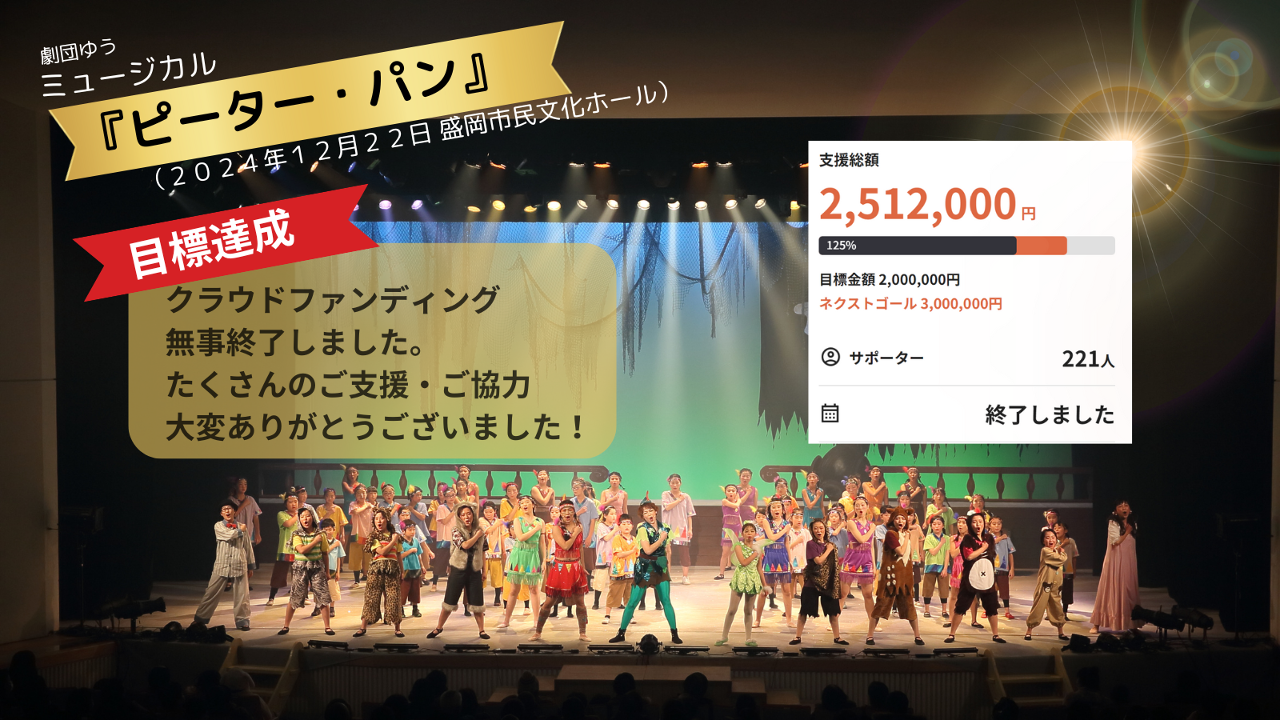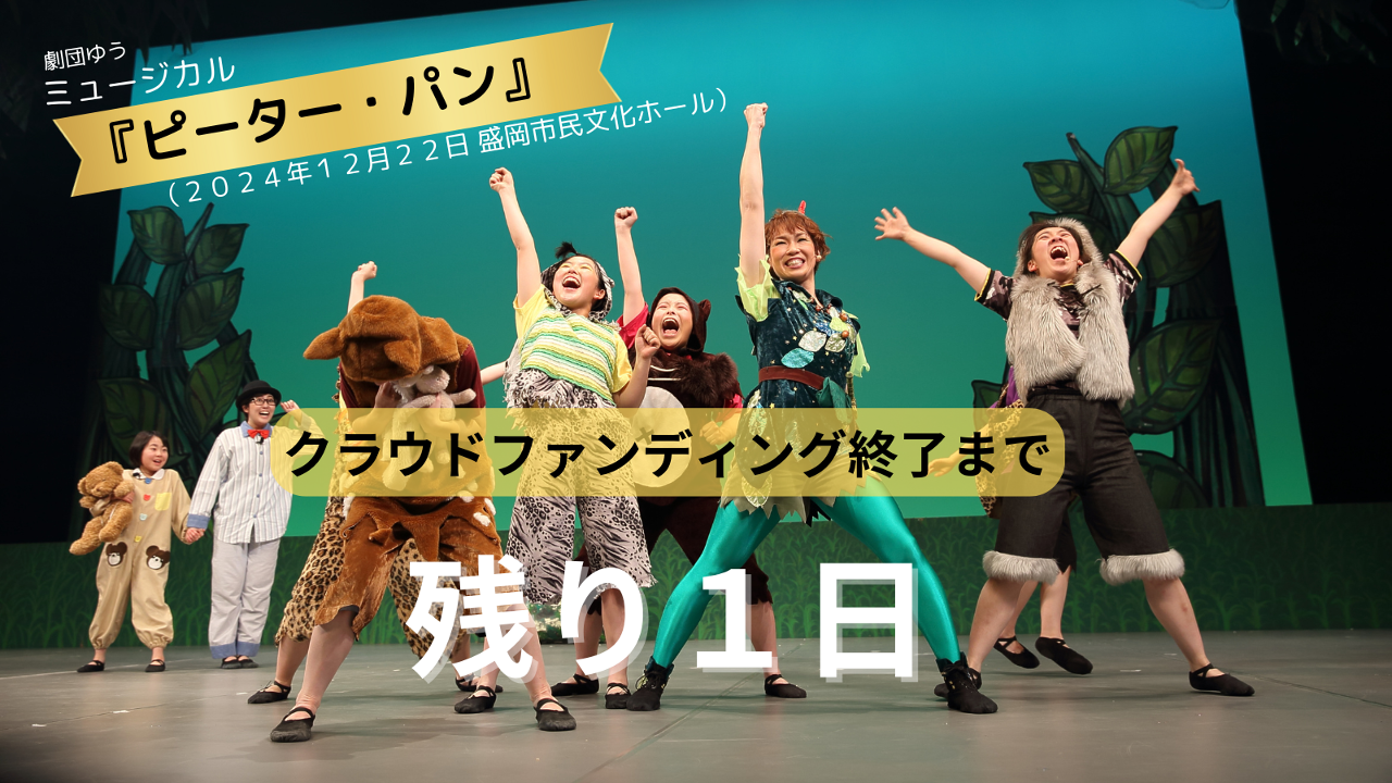 2024-10-19 07:19【劇団ゆう 参加型ミュージカル「ピーター・パン」クラウドファンディング終了まであと1日!】いつも応援ありがとうございます! 劇団ゆうの参加型ミュージカル「ピーター・パン」が、2024年12月22日、盛岡市民文化ホールで上演されます。この公演の成功に向けて、現在クラウドファンディングを実施中です。 おかげさまで、これまでに多くのご支援をいただき、ファーストゴールを達成することができました。皆様の温かいご協力に心より感謝いたします。支援金は公演開催にかかる費用や、子どもたちの活動に大切に使わせていただきます。 クラウドファンディングの終了まで残り1日となりました!ネクストゴール達成に向けて、最後の最後まで引き続きご支援をお願いしております。 一緒に参加型ミュージカル「ピーター・パン」を盛り上げましょう!たくさんの子どもたちに夢と感動を届けるため、ご支援、シェア、応援のほど、どうか最後までよろしくお願いします!2024-10-19 07:19【劇団ゆう 参加型ミュージカル「ピーター・パン」クラウドファンディング終了まであと1日!】いつも応援ありがとうございます! 劇団ゆうの参加型ミュージカル「ピーター・パン」が、2024年12月22日、盛岡市民文化ホールで上演されます。この公演の成功に向けて、現在クラウドファンディングを実施中です。 おかげさまで、これまでに多くのご支援をいただき、ファーストゴールを達成することができました。皆様の温かいご協力に心より感謝いたします。支援金は公演開催にかかる費用や、子どもたちの活動に大切に使わせていただきます。 クラウドファンディングの終了まで残り1日となりました!ネクストゴール達成に向けて、最後の最後まで引き続きご支援をお願いしております。 一緒に参加型ミュージカル「ピーター・パン」を盛り上げましょう!たくさんの子どもたちに夢と感動を届けるため、ご支援、シェア、応援のほど、どうか最後までよろしくお願いします!