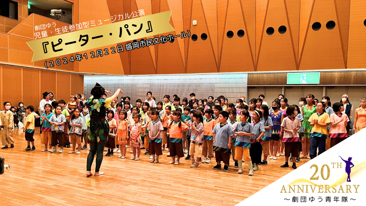 2024-12-23 20:19ついに本番!会場はほぼ満席!1,500人の観客を魅了!12月22日劇団ゆうの参加型ミュージカル公演が無事に終了しました✨ 岩手の子ども100人が参加し、劇団ゆうと一緒に練習を重ねた成果を発表🎶 フルスペックの舞台技術を盛り込んだ本公演は、参加者とその保護者、スタッフやボランティアを含め約300名で準備され、当日は約1500人の来場者で会場は熱気に包まれました🌸 子どもたちは緊張しながらも、笑顔いっぱいの演技と踊りを披露🌟 練習の成果が発揮され、感動のステージとなりました👏 観劇していた子どもたちから「私も出たい!」という声がたくさん聞かれました。 同じ年代の子どもたちが出演する舞台を観劇することで、観劇した子どもたちも、新たな文化との出会い、参加した子どもたちも、様々な年代の子どもたち、大人との出会いがありました。 この舞台をご用意していただけましたこと、すべてのご支援者様に、心より深く感謝申し上げます。 ※写真場面(海賊船)2024-12-23 20:19ついに本番!会場はほぼ満席!1,500人の観客を魅了!12月22日劇団ゆうの参加型ミュージカル公演が無事に終了しました✨ 岩手の子ども100人が参加し、劇団ゆうと一緒に練習を重ねた成果を発表🎶 フルスペックの舞台技術を盛り込んだ本公演は、参加者とその保護者、スタッフやボランティアを含め約300名で準備され、当日は約1500人の来場者で会場は熱気に包まれました🌸 子どもたちは緊張しながらも、笑顔いっぱいの演技と踊りを披露🌟 練習の成果が発揮され、感動のステージとなりました👏 観劇していた子どもたちから「私も出たい!」という声がたくさん聞かれました。 同じ年代の子どもたちが出演する舞台を観劇することで、観劇した子どもたちも、新たな文化との出会い、参加した子どもたちも、様々な年代の子どもたち、大人との出会いがありました。 この舞台をご用意していただけましたこと、すべてのご支援者様に、心より深く感謝申し上げます。 ※写真場面(海賊船)