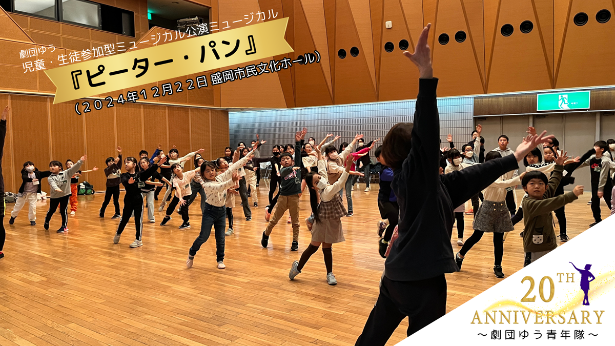 2024-12-02 17:27第3回目の練習!ミュージックに合わせて迫力ある踊りを!🎭盛岡市民文化ホールで12月22日に開催される児童参加型ミュージカル『ピーター・パン』に向けた準備が絶好調です!✨劇団ゆう青少年隊の20周年を記念するこの特別な舞台では、子どもたちが一体となって練習に励んでいます💃🕺。 🎶12月1日に行われた第3回目の練習では、最初の緊張感もほぐれ、子どもたちは振り付けをしっかり覚え始めました🙌。曲全体の流れが見え始め、自信を持って踊る姿がとても印象的でした!😄✨ 🌟練習中の笑顔や力強い動きからは、彼らの成長と本番に向けた意気込みが伝わってきます。本番に向けて、さらに素晴らしいパフォーマンスを見せてくれることでしょう!🌈 ぜひ、子どもたちの一生懸命な姿をご覧いただき、心に残る舞台をお楽しみください💖。2024-12-02 17:27第3回目の練習!ミュージックに合わせて迫力ある踊りを!🎭盛岡市民文化ホールで12月22日に開催される児童参加型ミュージカル『ピーター・パン』に向けた準備が絶好調です!✨劇団ゆう青少年隊の20周年を記念するこの特別な舞台では、子どもたちが一体となって練習に励んでいます💃🕺。 🎶12月1日に行われた第3回目の練習では、最初の緊張感もほぐれ、子どもたちは振り付けをしっかり覚え始めました🙌。曲全体の流れが見え始め、自信を持って踊る姿がとても印象的でした!😄✨ 🌟練習中の笑顔や力強い動きからは、彼らの成長と本番に向けた意気込みが伝わってきます。本番に向けて、さらに素晴らしいパフォーマンスを見せてくれることでしょう!🌈 ぜひ、子どもたちの一生懸命な姿をご覧いただき、心に残る舞台をお楽しみください💖。