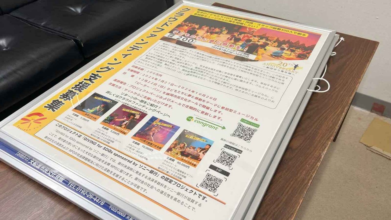 子どもたちを2024年12月22日盛岡市民文化ホールで開催される劇団ゆうミュージカル『ピーター・パン』の鑑賞チケットを子ども20名にギフトできる権利です。パンフレットに支援者様のお名前を掲示させて頂きます。20枚のギフトチケットの裏面にご支援者さまの名前を掲載させていただきます。【※注意】ご寄付いただいた後のキャンセルはできません。※このチケットは事務局が責任を持って20名の子どもたちにギフトさせていただきます。