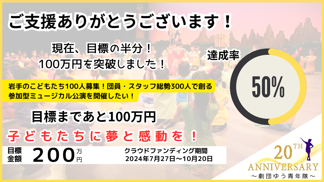 この活動を通じて、華やかな舞台に立ち、努力する過程が子どもたちの成長に欠かせないことを確信しました。このたび、33年の歴史を持つ劇団ゆうの新たな挑戦として、次世代にこの活動を繋いでいくことを目指し、「子どもたちに夢と感動を」をテーマに、参加者とともに創るミュージカル公演を開催いたします。