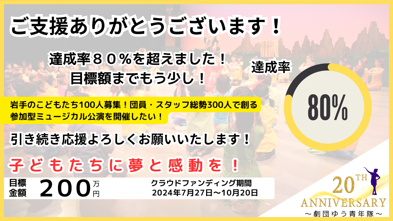 皆様の温かいご支援のおかげで、劇団ゆうのクラウドファンディングが目標金額の 80% に到達いたしました!たくさんの応援とご協力、本当にありがとうございます。